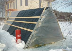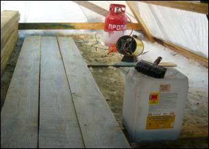 В зимний период обработка пиломатериала огнебиозащитой, проводится в строительном тепляке.