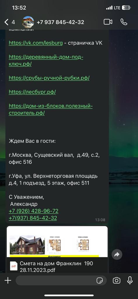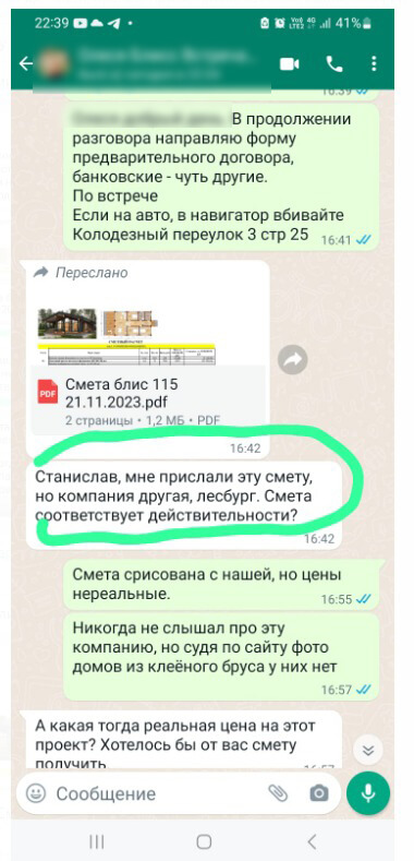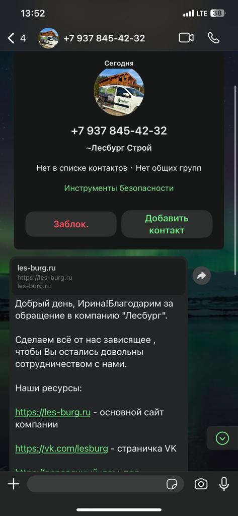 По нашей информации некий менеджер Олег К , являющийся сотрудником "Лесбург-Строй", незаконно в нарушение этических и коммерческих норм "позаимствовал" сметы, лиды и расценки нашей компании АПС ДСК.