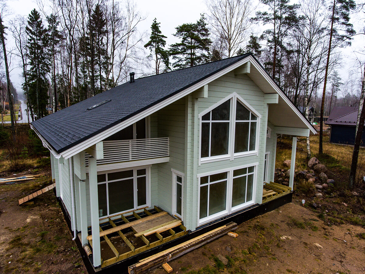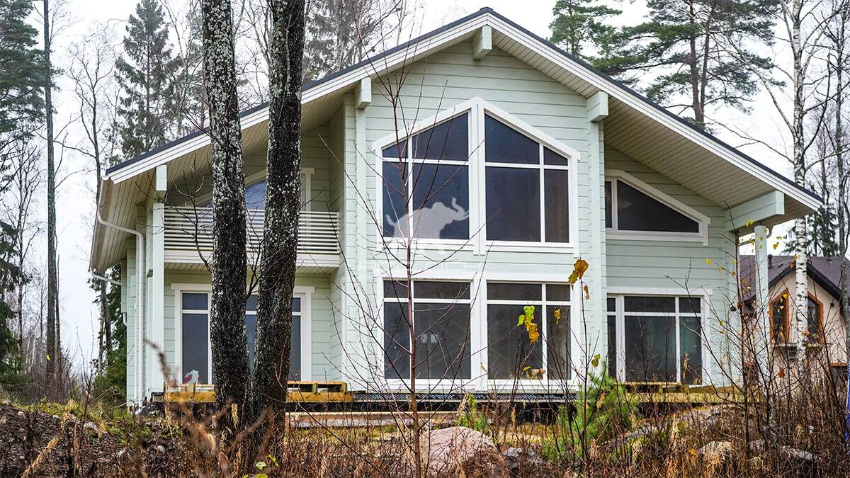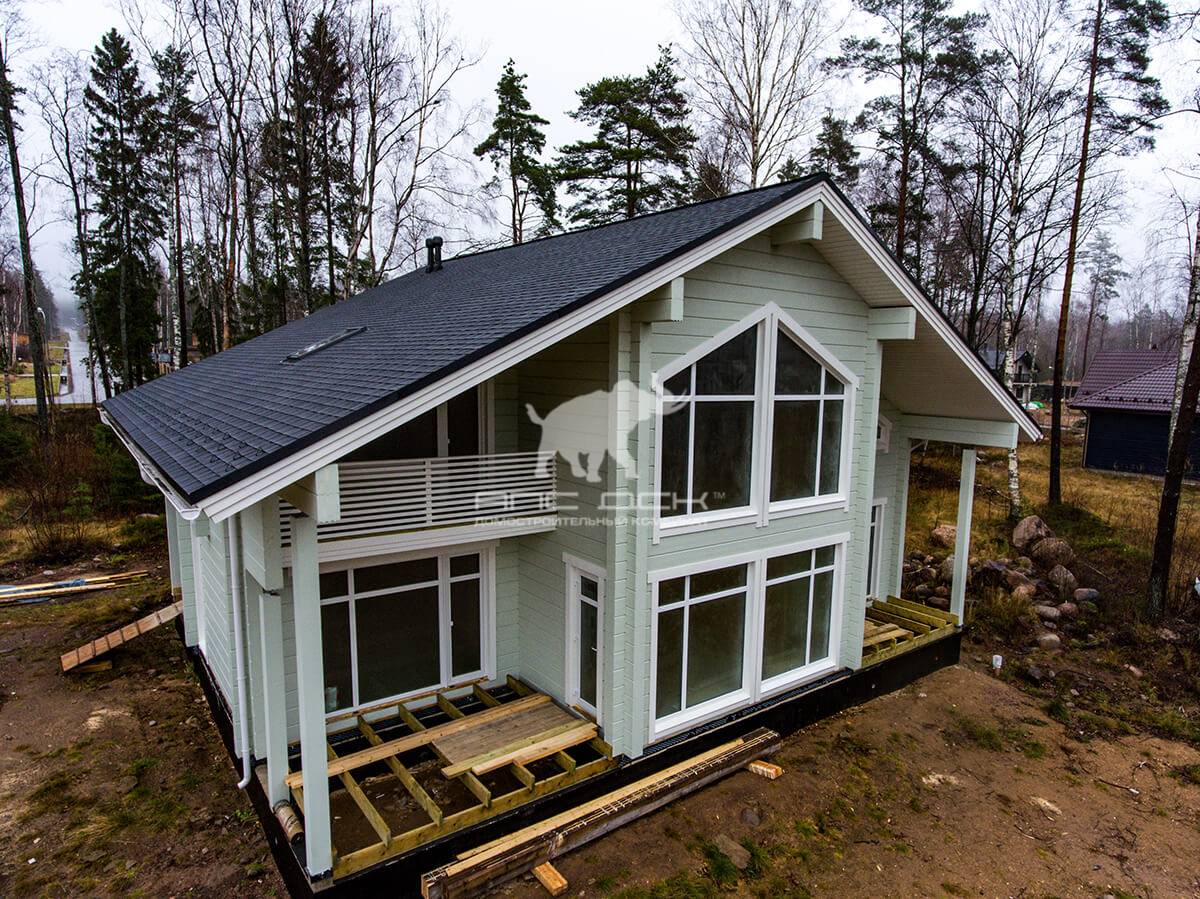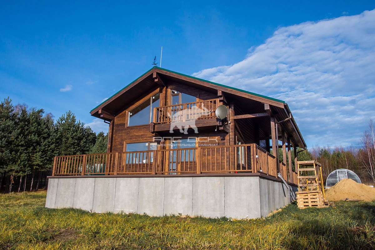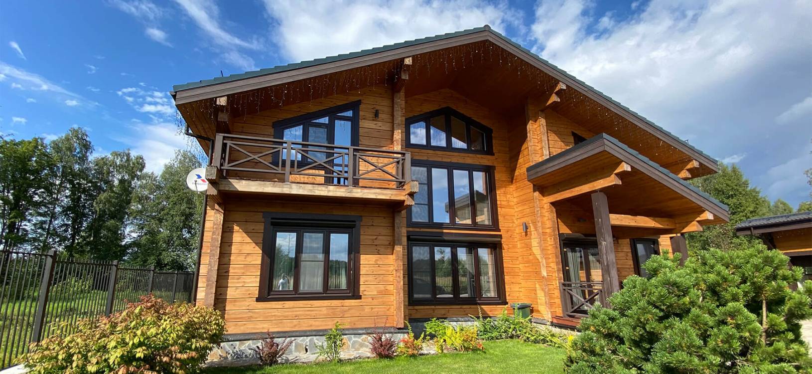 Коттедж из клееного бруса после окрашивания, отлично впишется в окружающее пространство, и станет вашей гордостью и украшением участка.