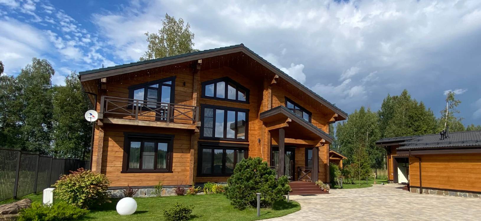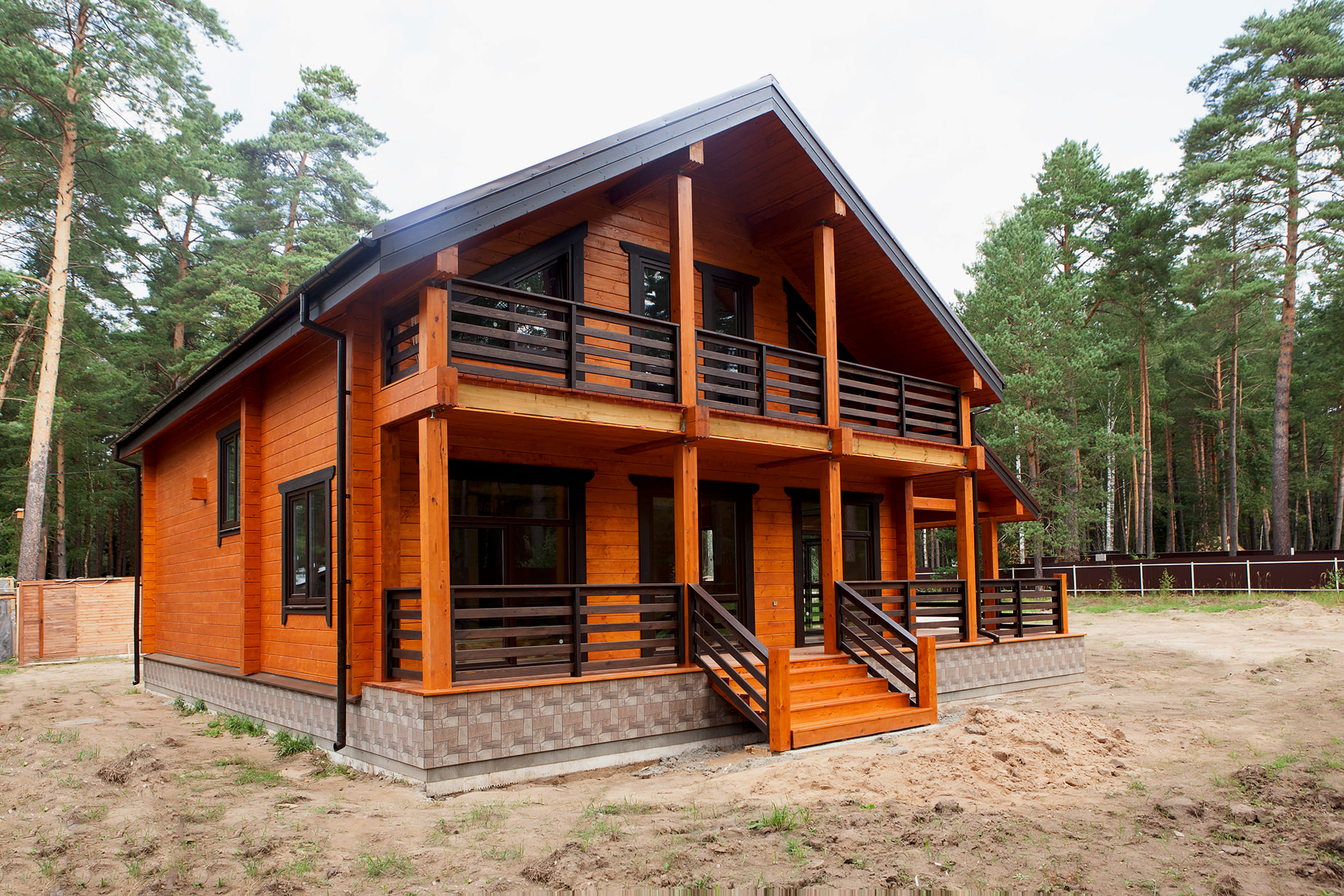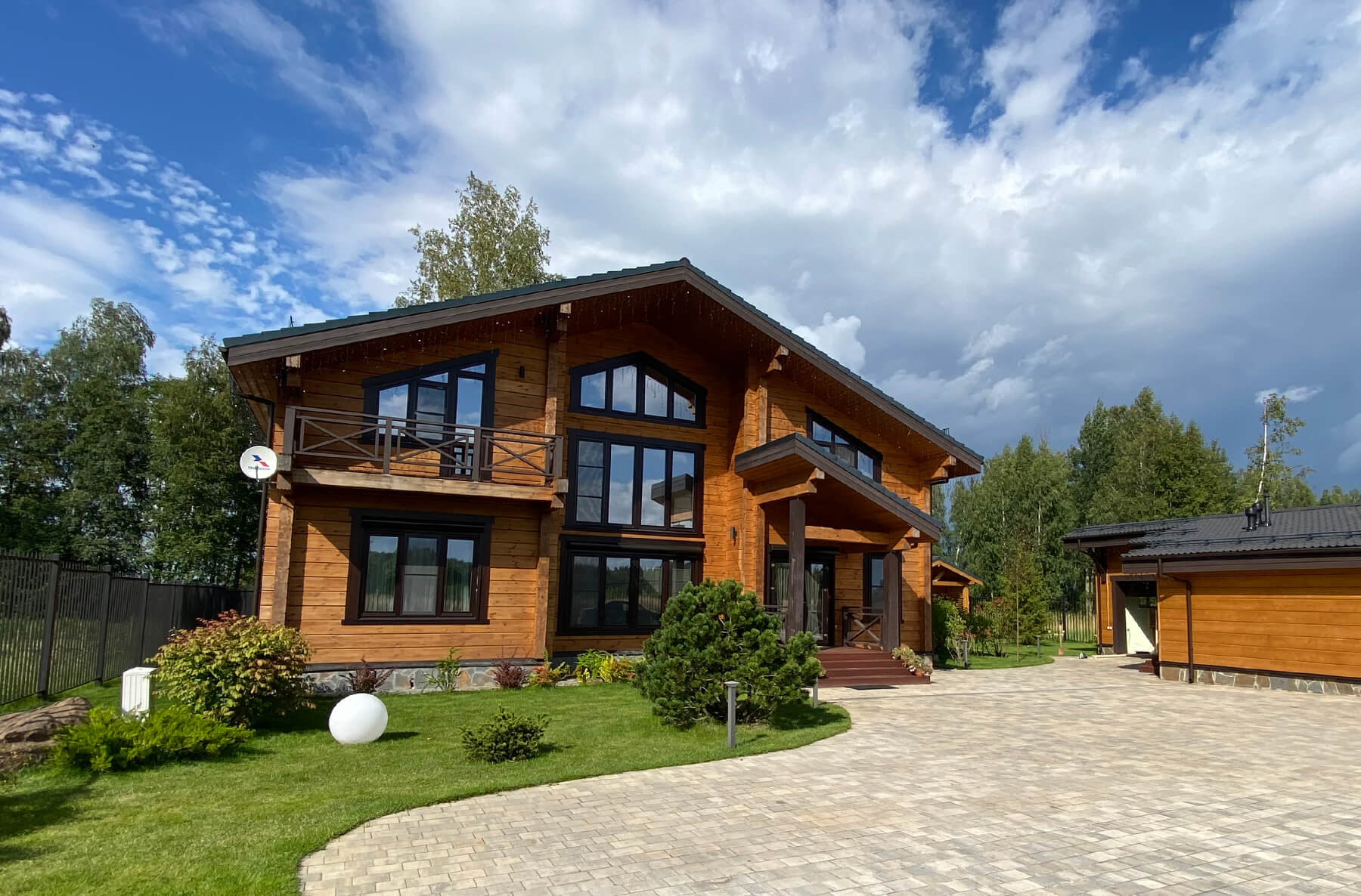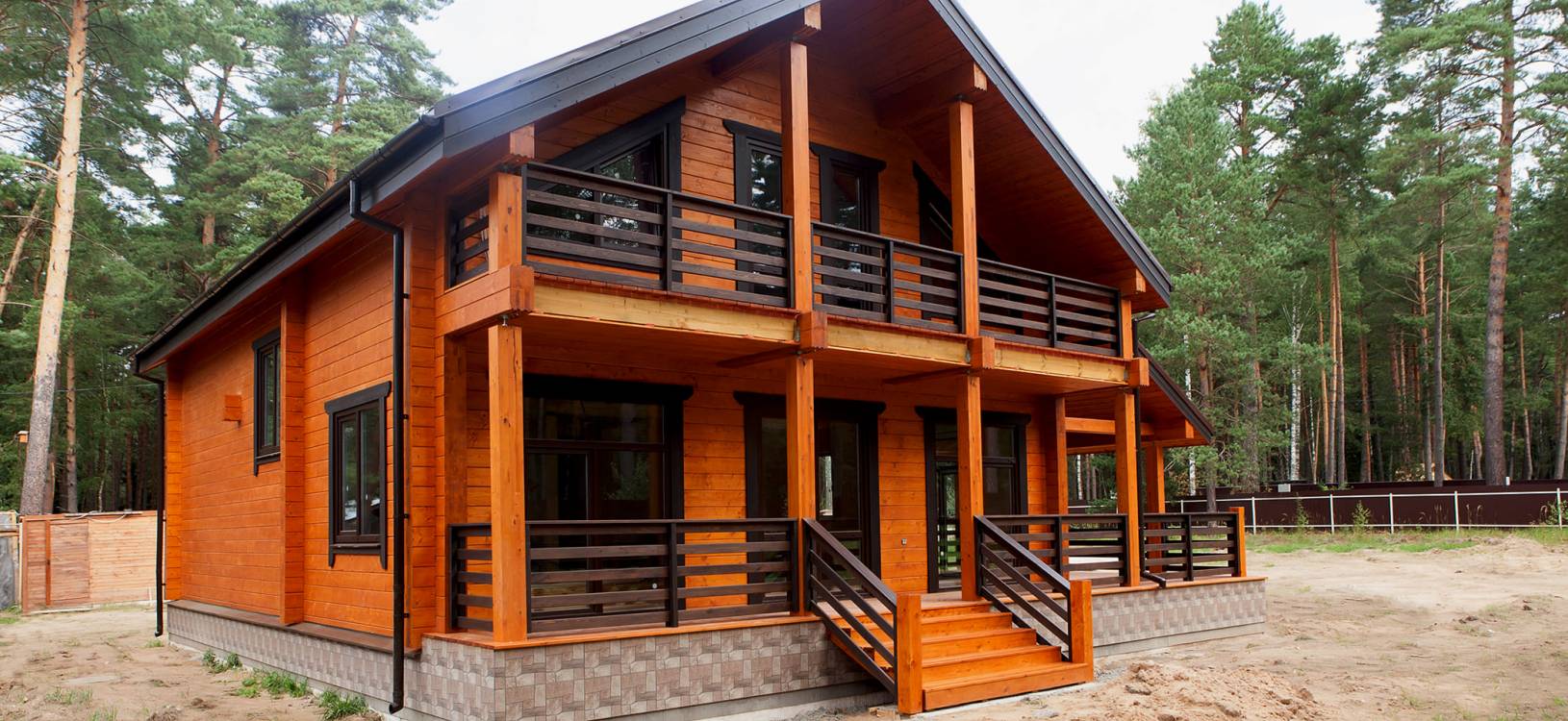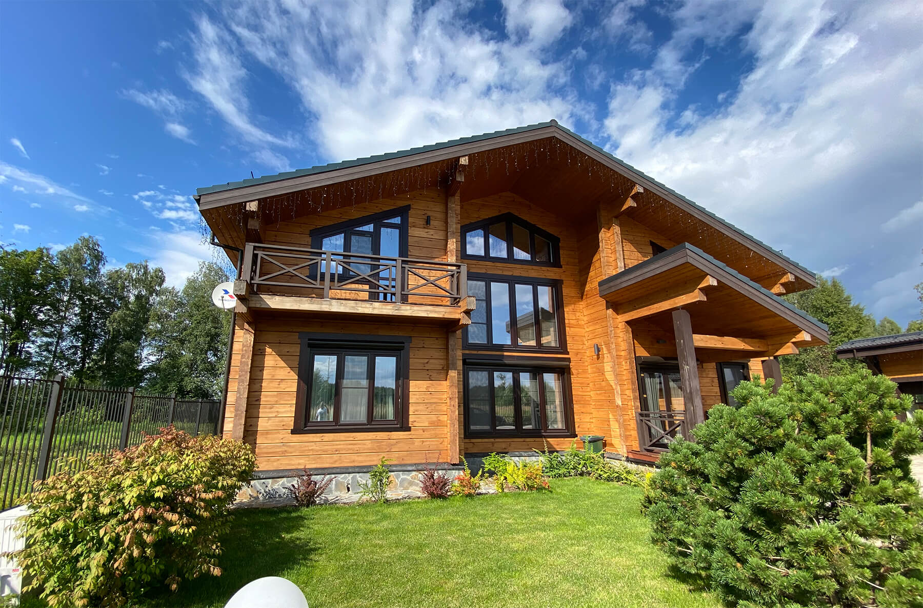 Коттедж из клееного бруса после окрашивания, отлично впишется в окружающее пространство, и станет вашей гордостью и украшением участка.