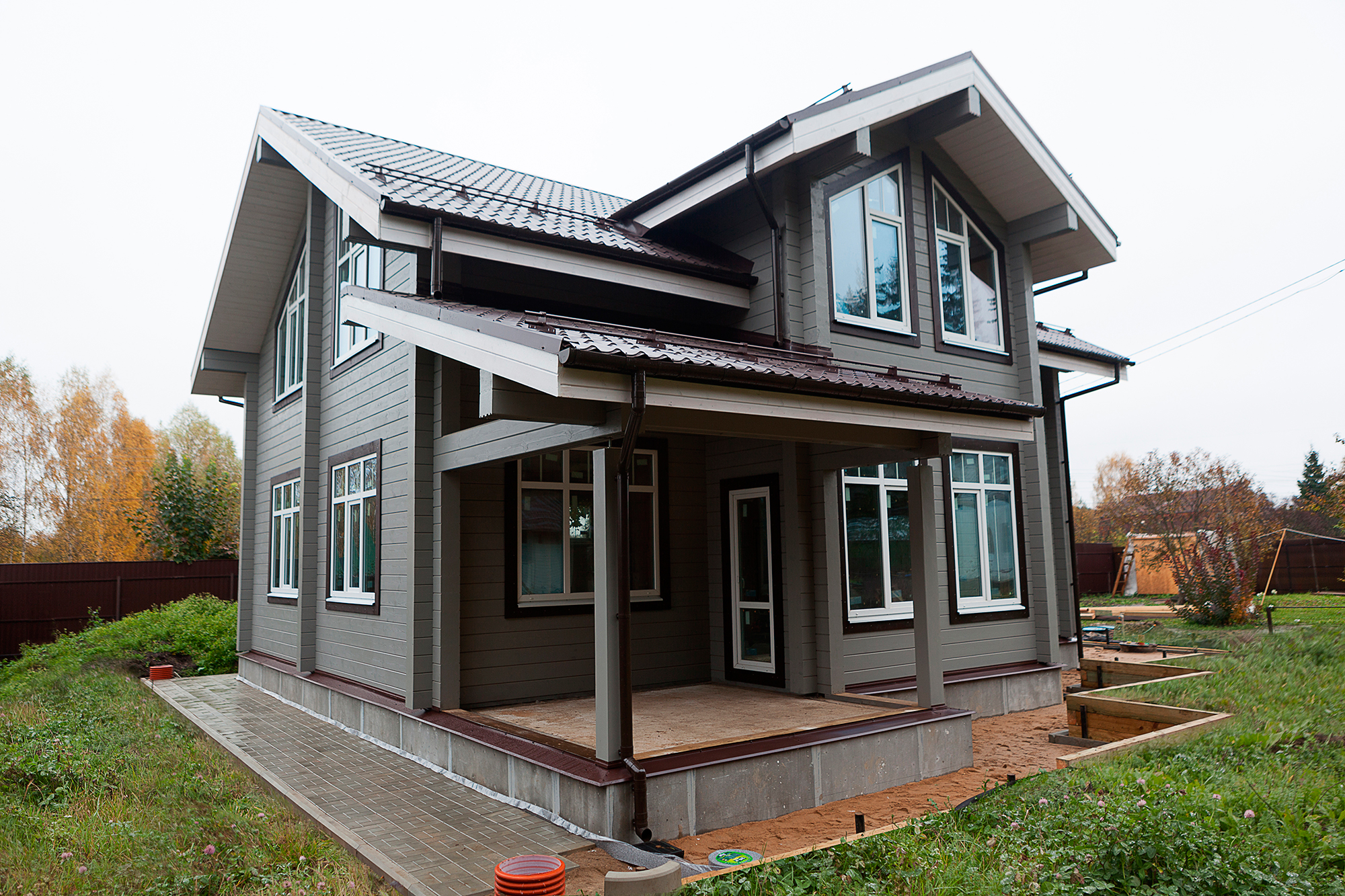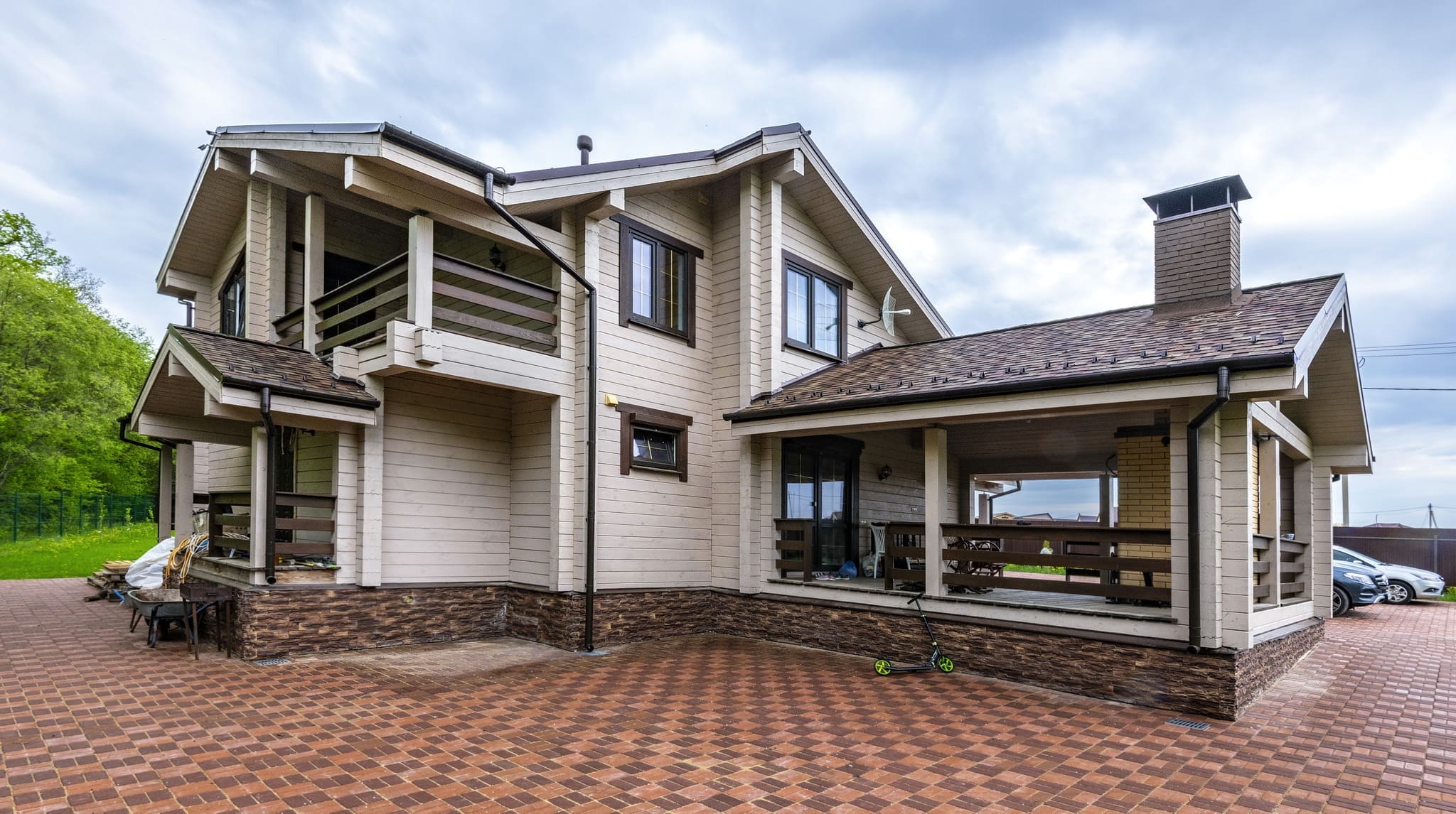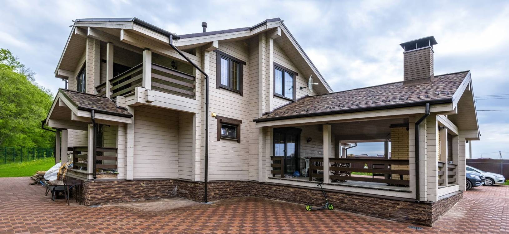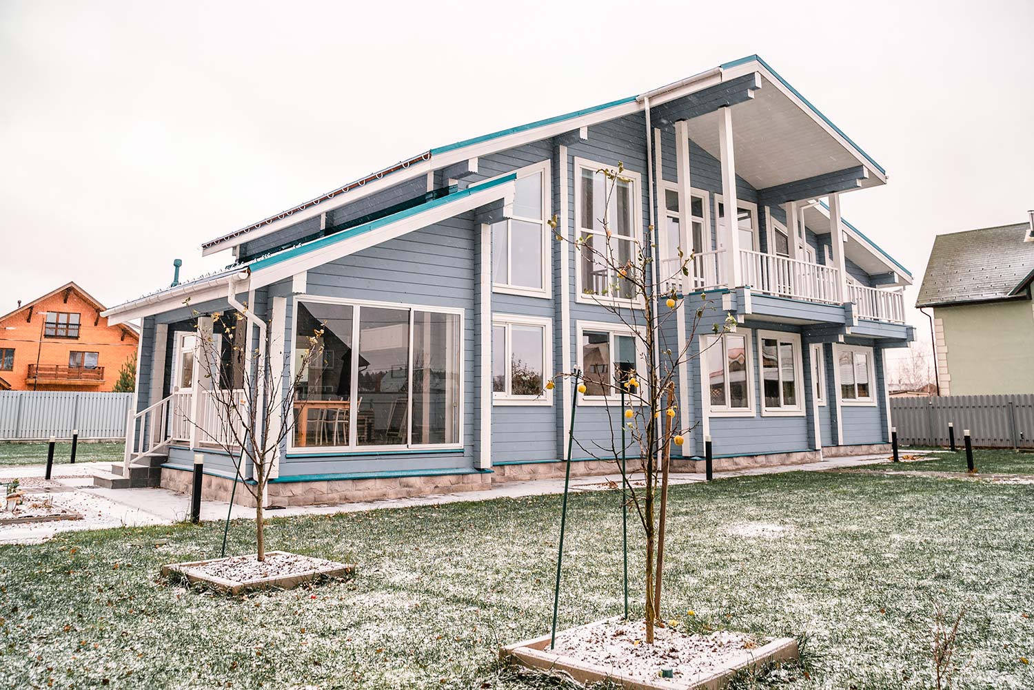 Коттедж из клееного бруса после окрашивания, отлично впишется в окружающее пространство, и станет вашей гордостью и украшением участка.